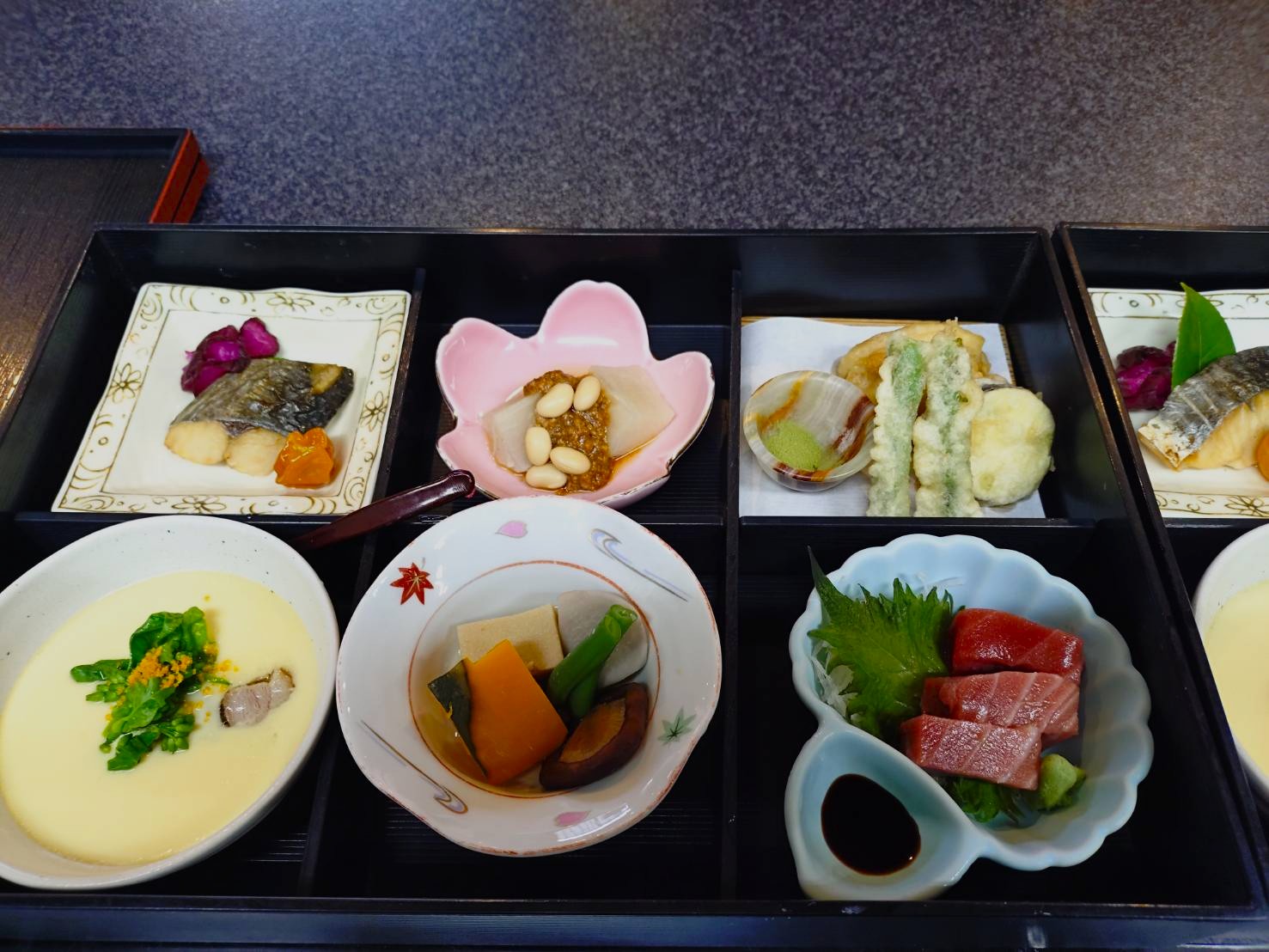 お造り・炊き合わせ・蒸し物・天ぷら・鶏味噌ふろふき大根・さわらの焼き物・ご飯・赤出汁